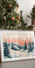 Uma poética cena de inverno, onde abetos nascem em uma paisagem nevada, enquanto finos flocos de neve caem silenciosamente no ar fresco e claro. O céu suave e os contornos suaves criam uma atmosfera natalina tranquila - perfeita para trazer calma, presença e aconchego nórdico para a casa. A composição convida à contemplação e à tranquilidade invernal em qualquer ambiente.