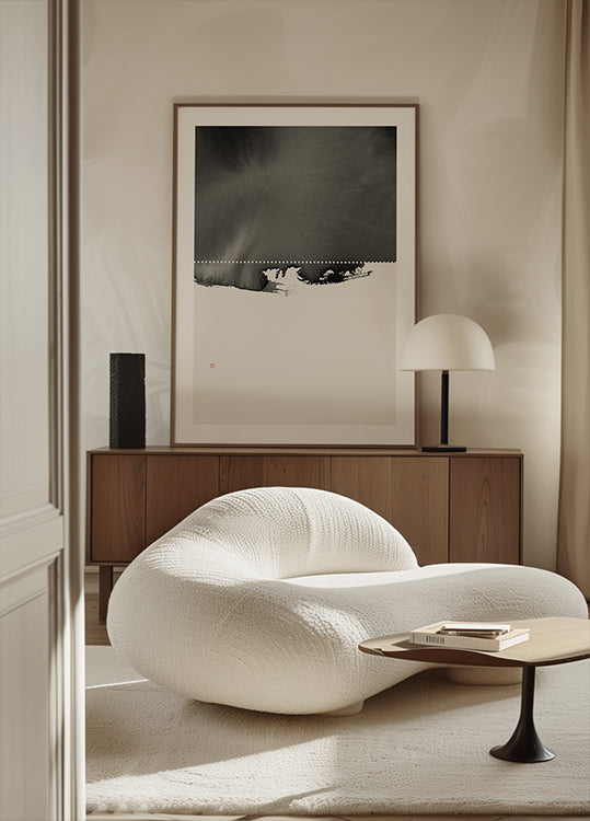 Perforation af Thoth Adan er en rolig, monokrom komposition, hvor bløde akvareltoner møder en præcis linje og en række subtile "huller" som prikker i sne. Det grafiske brud skaber følelse af kant, stillhed og vinterlig frost, mens den luftige balance mellem lys og mørke giver billedet en zen-agtig ro.