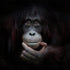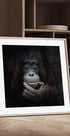 Um close-up intenso de um orangotango sorridente e pensativo, capturado com iluminação baixa e temperamental que destaca a textura do pelo e os olhos humanos profundos. Fotografado pela fotógrafa alemã Antje Wenner-Braun no Zoológico de Rostock, o tema convida à reflexão tranquila e à calma calorosa e empática no ambiente. Perfeito para sala de estar, escritório ou espaço criativo.