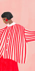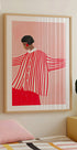 Ilustração estilizada de uma figura em uma ousada roupa listrada de vermelho e branco contra um fundo rosa suave, capturando a essência da arte da moda moderna. O design minimalista e as cores vibrantes acrescentam elegância dinâmica a esta obra de arte contemporânea.