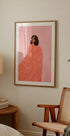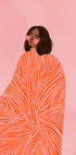 Uma mulher envolta em uma capa esvoaçante e vibrante com padrão laranja contra um fundo rosa suave. Esta ilustração contemporânea captura calor e estilo com uma expressão minimalista e abstrata, perfeita para os amantes da arte contemporânea em busca de inspiração.