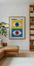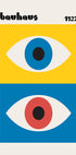 Um pôster distinto inspirado na Bauhaus com dois olhos estilizados em blocos de cores fortes de amarelo, azul, vermelho e preto. Este design abstrato capta a essência da Bauhaus 1923, com uma combinação de formas minimalistas e contrastes marcantes. Perfeito para quem gosta de design vintage, icônico e modernista.