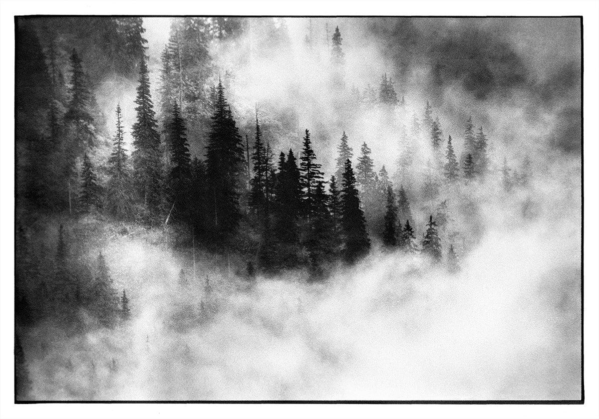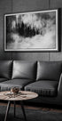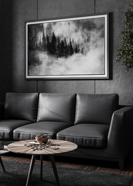 Um pôster dramático em preto e branco de uma floresta envolta em névoa, com altos abetos emergindo da névoa. Gravado na Polónia, cria uma atmosfera de mistério e tranquilidade - ideal para casas minimalistas e modernas.