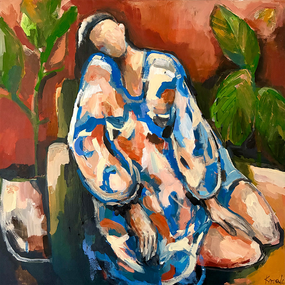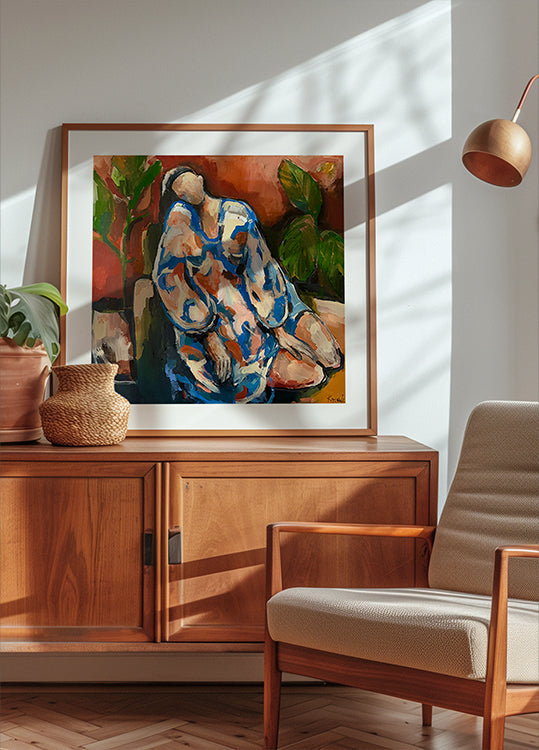Alice de Magdalena Krzak é um retrato botânico moderno em tons profundos de azul e verde. O olhar calmo da mulher e as pinceladas pictóricas criam um equilíbrio harmonioso entre geometria e natureza. As formas das folhas circundam a figura e proporcionam um foco contemplativo e elegante no ambiente. Perfeito como uma peça central calma na sala de estar, quarto ou escritório.