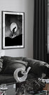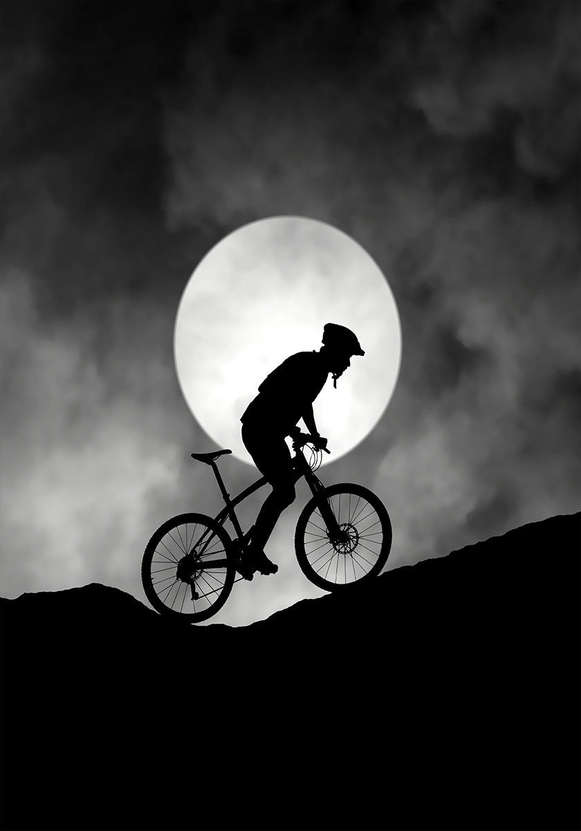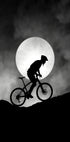 Uma poderosa imagem de silhueta em preto e branco de um ciclista subindo uma colina sob uma lua cheia brilhante. O contraste dramático entre luz e sombra cria um cenário surreal e aventureiro que captura a emoção da pilotagem noturna, a determinação e a resistência tendo como pano de fundo a natureza.
