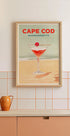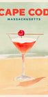 Um animado pôster retrô de Cape Cod, Massachusetts, apresentando um coquetel clássico em uma taça de martini coberta com uma cereja. Com um cenário de praia e tons quentes, esta obra de arte captura o charme costeiro, o relaxamento e a vibração atemporal do verão pelos quais Cape Cod é conhecida.