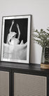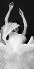 Um impressionante retrato em preto e branco de uma mulher com um vestido plissado escultural, capturado em meio ao movimento. As dobras dramáticas e o tecido fluido criam uma sensação de ritmo e elegância, que lembra tanto a dança quanto a escultura abstrata. Uma obra de arte monocromática ousada que mistura moda, movimento e arte.