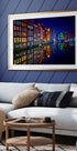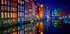 Uma brilhante vista noturna das icônicas casas do canal de Amsterdã, onde as fachadas coloridas brilham na luz e se refletem perfeitamente nas águas paradas. Esta animada paisagem urbana celebra a arquitetura holandesa, o charme urbano e os reflexos mágicos que tornam Amsterdã inesquecível à noite.