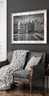 Uma representação icônica em preto e branco do Damrak de Amsterdã: as famosas casas dançantes apresentam um ritmo gráfico ao longo do canal, com reflexos nas águas calmas e nas nuvens dramáticas acima da cidade. Melanie Viola captura a fachada histórica e a pulsação urbana em um motivo atemporal, perfeito para o design de interiores moderno e nórdico da casa.