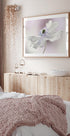 Um delicado close-up de uma flor de anêmona branca, onde pétalas macias se desdobram com movimentos graciosos. Capturada em sonhadoras cores pastel de rosa e roxo, esta obra de arte botânica destaca a fragilidade e a beleza da natureza e adiciona um clima calmo e elegante a qualquer interior.