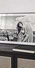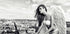 Uma dramática obra de arte em preto e branco de uma mulher com asas de anjo olhando para o vasto horizonte da cidade. Combinando fantasia e realismo urbano, esta imagem impressionante evoca força, beleza e mistério – uma presença angelical contra o horizonte da metrópole moderna.