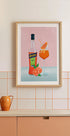 Uma ilustração fresca e animada do Aperol Spritz, apresentando uma garrafa, frutas cítricas e uma taça de coquetel com gelo e guarnição de laranja sobre um fundo rosa suave. Lendária e colorida, esta obra de arte capta a essência do verão italiano e da cultura do aperitivo, perfeita para cozinhas, bares e espaços sociais.
