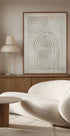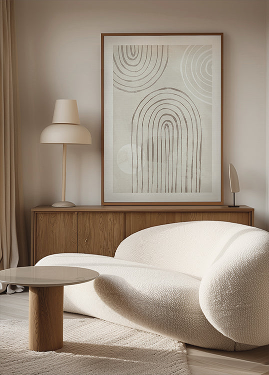 Um pôster abstrato desenhado à mão com linhas curvas orgânicas e padrões circulares em tons suaves de bege. A geometria imperfeita e fluida adiciona calor e textura e dá à obra de arte um toque natural e artístico. Perfeito para interiores minimalistas de inspiração japonesa e escandinava.