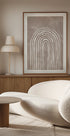 Um pôster abstrato minimalista com linhas arqueadas desenhadas à mão em branco nítido sobre um fundo texturizado bege suave. A geometria orgânica e os tons neutros das cores proporcionam um equilíbrio suave, ideal para interiores japoneses, escandinavos ou minimalistas modernos.