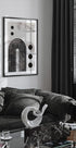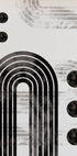 Um impressionante pôster abstrato com arcos pretos ousados, formas circulares e linhas geométricas em camadas sobre um fundo de textura clara. A paleta monocromática enfatiza a simetria e o equilíbrio, tornando-se uma afirmação elegante em interiores modernos, de inspiração japonesa ou escandinava.