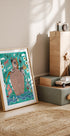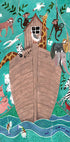Uma ilustração lúdica e colorida da arca de Noé repleta de animais como girafas, elefantes, zebras, macacos e pássaros. Cercada por flores exuberantes e águas vivas, esta encantadora obra de arte captura a alegria e a imaginação da amada história bíblica. Perfeito para quartos infantis, creches ou para quem adora ilustrações de animais.