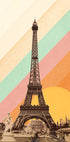 Uma atraente ilustração de inspiração retrô da Torre Eiffel em Paris, contra um fundo ousado com listras de arco-íris e um sol dourado quente. A combinação de fotografia vintage e design gráfico vibrante cria uma obra de arte nostálgica, porém moderna, inspirada em viagens, perfeita para os amantes de Paris, arquitetura e decoração de parede colorida.