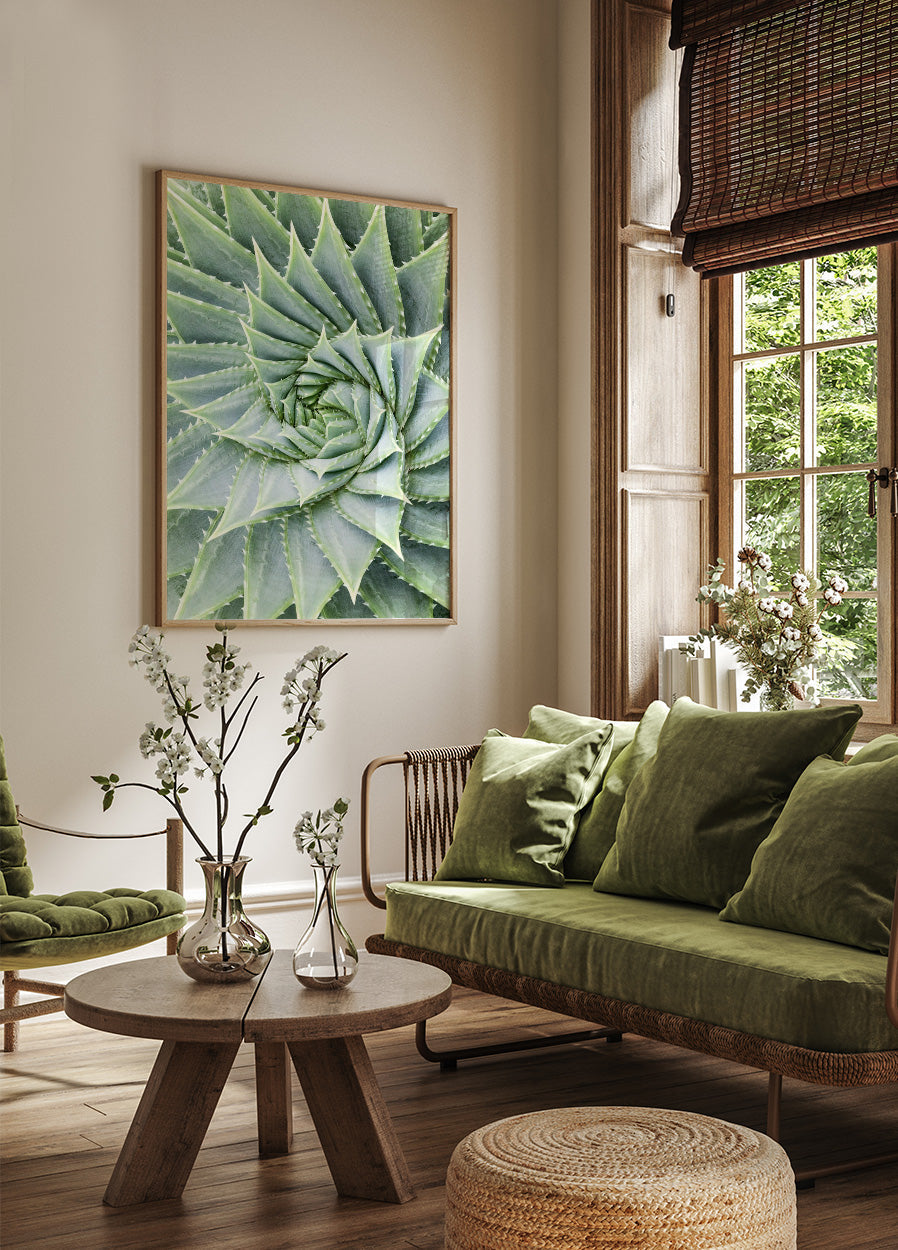 O pôster mostra um close-up de uma planta de aloe vera com uma estrutura espiral de folhas verdes. As folhas pontiagudas irradiam do centro, criando um padrão visual que destaca a simetria e a textura naturais da planta. As cores são suaves e discretas, conferindo uma expressão calma e orgânica.