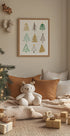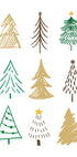 Uma ilustração moderna e minimalista com uma coleção de desenhos abstratos de árvores de Natal em verde, dourado e marrom. Cada árvore tem um estilo único desenhado à mão, perfeito para decorações de Natal e arte de parede festiva.