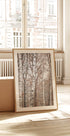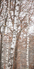 Uma cena florestal pacífica com bétulas delgadas e altas com sua casca branca contra um fundo suave de outono e inverno. Os finos galhos e folhas restantes criam uma atmosfera poética que une o calor do outono com a calma do inverno. Perfeito para amantes da natureza e casas aconchegantes.