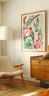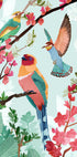 Uma ilustração animada e tropical de pássaros coloridos sentados e voando entre ramos e flores exuberantes. Com fortes tons de verde, vermelho e azul, a obra capta a alegria e a vitalidade da vida selvagem do verão. Perfeito para adicionar um toque fresco e exótico a qualquer ambiente.
