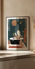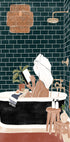 Uma ilustração aconchegante de uma mulher relaxando em uma banheira e lendo um livro com uma toalha na cabeça. Cercada por modernos acessórios de banheiro, tons quentes de terra e um toque de verde, a obra irradia calma e auto-indulgência. Perfeito para criar uma atmosfera relaxante em casa.