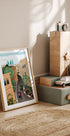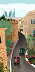 Uma ilustração colorida de carros de Fórmula 1 circulando pelas ruas históricas de Baku, no Azerbaijão. A obra de arte combina o charme da arquitetura antiga com o horizonte moderno, com as icônicas Flame Towers ao fundo. Uma obra dinâmica que capta a velocidade, a cultura e a emoção do Grande Prémio de Baku.