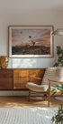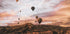 Uma paisagem deslumbrante da Capadócia ao entardecer com balões de ar quente voando pelo céu. As cores quentes do deserto e as nuvens dramáticas proporcionam uma sensação de liberdade e aventura, perfeitas para arte de parede inspirada em viagens.