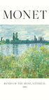 Uma serena obra-prima impressionista de Claude Monet, pintada em 1880, mostrando as margens do Sena em Vétheuil. A obra de arte captura a vegetação exuberante, as flores silvestres desabrochando e o reflexo da água sob um céu calmo. Um exemplo atemporal do domínio de Monet sobre luz, cor e atmosfera.