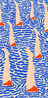 Uma ilustração ousada e divertida de nadadores sincronizados, mostrados de cabeça para baixo com as pernas estendidas para fora da água azul estampada. Os maiôs vermelhos vibrantes contrastam com as ondulações rítmicas, criando uma composição abstrata e animada que mistura esporte, humor e design moderno.