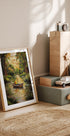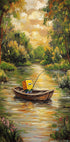 Uma paródia humorística que combina o estilo clássico de paisagem de pintura a óleo com a cultura pop. A cena mostra um personagem de desenho animado pescando pacificamente em um barco de madeira cercado por árvores exuberantes e um rio brilhante. Uma mistura divertida de natureza e humor surreal, perfeita para fãs de arte de parede peculiar.