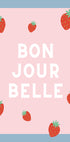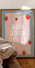 Adicione charme francês à sua casa com esta lenda Bon Jour Bela-poster. Rodeado de morangos vermelhos em suaves tons pastéis, combina doçura e estilo. Perfeito para cozinhas, cafés ou como arte de parede alegre, proporcionando um toque fresco de cor e um complemento diário ao seu espaço.