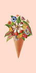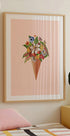 Um pôster de arte surreal e divertido apresentando um buquê de flores vintage vibrantes dispostas em uma casquinha de sorvete contra um fundo rosa pêssego macio. Combinando natureza e nostalgia, esta obra de arte de colagem exclusiva é uma peça perfeita para interiores modernos, retrô e ecléticos.