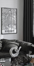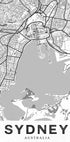 Um mapa limpo em preto e branco de Sydney, onde a rede de ruas da cidade e o litoral sinuoso se desdobram em linhas nítidas e detalhes finos. A silhueta do porto e dos bairros distintivos destacam-se claramente, enquanto a textura subtil dá uma sensação discreta e vintage - perfeita para design de interiores moderno e retro na casa.