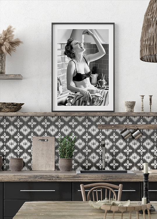 Uma fotografia em preto e branco divertida e ousada de uma mulher saboreando espaguete em uma cozinha inspirada no vintage. Com uma atitude descontraída, ela exala confiança e humor, tornando esta obra de arte uma adição elegante e divertida aos interiores modernos. Perfeito para decoração de cozinha, gourmets e entusiastas da fotografia.