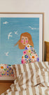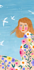 Uma ilustração caprichosa e colorida de uma mulher envolta em uma capa floral contra um céu azul claro. Cercada por pássaros voando, a obra evoca liberdade, alegria e o espírito fresco da primavera. Lendário, mas também calmo, une natureza e fantasia num estilo moderno e animado.