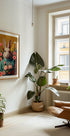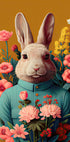 Um pôster imaginativo e charmoso com um coelho em uma jaqueta turquesa cercado por flores desabrochando. A composição lúdica combina ilustração vintage com fantasia surreal, perfeita para quarto infantil, brinquedoteca ou para quem adora retratos humorísticos de animais.