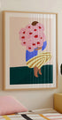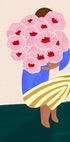 Uma ilustração abstrata moderna de uma mulher segurando um grande buquê de flores rosa, pintadas em cores fortes e vibrantes. Com suas formas minimalistas, calças listradas e design moderno, esta obra de arte se encaixa perfeitamente em interiores elegantes. Uma decoração de parede divertida e elegante.