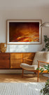 Uma obra de arte abstrata flamejante que mistura tons de vermelho, laranja e dourado, evocando tanto o fluxo da água quanto a intensidade do fogo. Com redemoinhos pictóricos e texturas suaves, a peça irradia calor, paixão e energia – perfeita para interiores arrojados ou como peça central dramática.