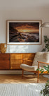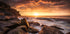 Uma paisagem marinha deslumbrante em Cape Solander, Sydney, capturada ao nascer do sol. A luz dourada do sol flui no horizonte, iluminando as ondas do mar e as rochas cruas com uma luz quente e brilhante. A água sedosa, criada pela longa exposição, contrasta lindamente com o céu dramático e cheio de nuvens e evoca força e calma.