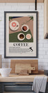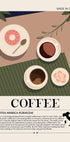 Um pôster de inspiração italiana mostrando o contorno de xícaras de café, uma sobremesa e cubos de açúcar sobre uma mesa. O pôster destaca a história e o processo de produção do café com foco na tradição italiana do café expresso. Perfeito para cafés, amantes do café e entusiastas da cultura italiana.
