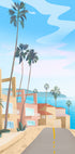 Uma ilustração costeira brilhante e colorida com palmeiras, casas à beira-mar e o mar cintilante. Esta obra de arte captura a vibração descontraída do verão da Califórnia, perfeita para decoração de parede inspirada na praia e em viagens.