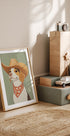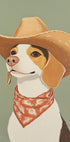 Uma obra lúdica e charmosa de um cachorro beagle vestido de cowboy, com chapéu largo e bandana estampada. Este retrato humorístico de um animal combina o estilo ocidental rústico com humor leve – perfeito para amantes de cães e coleções de arte de parede extravagantes.