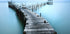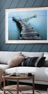 Uma fotografia serena de longa exposição da ponte de madeira da Carrasqueira, em Portugal, estendendo-se em águas calmas e azul-turquesa. O mar sedoso e as tábuas rústicas criam uma cena costeira tranquila e atemporal, perfeita para arte de parede serena.