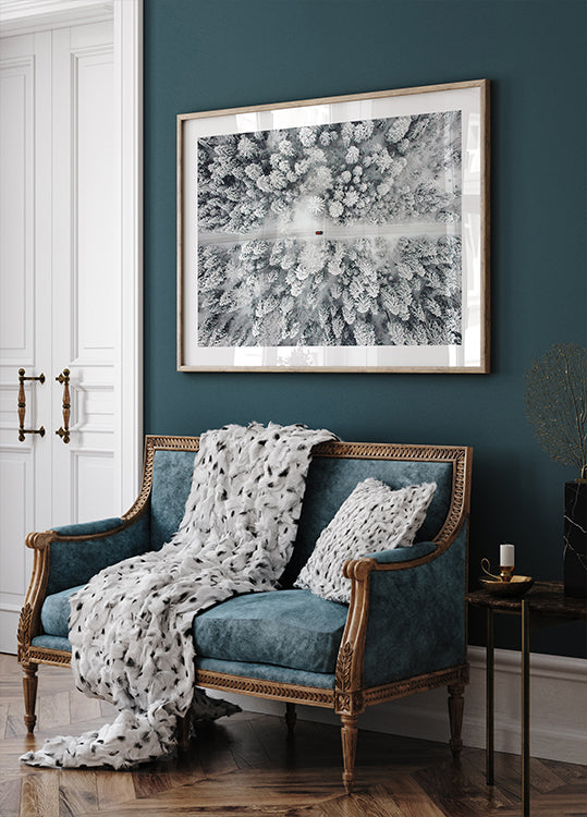 Pôster de carro vermelho dirigindo pela floresta nevada