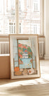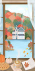 Uma cena aconchegante de outono vista de uma janela, com uma charmosa cabana à beira do lago cercada por folhas coloridas de outono. Os detalhes sazonais quentes da ilustração com abóbora, torta, café e velas a tornam perfeita para interiores em estilo de fazenda, rústicos e de inspiração aconchegante.