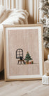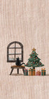 Uma encantadora obra de arte inspirada em bordados apresentando um gato preto sentado perto de uma janela olhando para a neve. Uma árvore de Natal decorada com presentes cria aconchego e clima natalino, perfeita como decoração natalina para a casa.