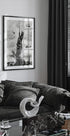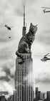 Uma obra de arte surreal e bem-humorada que retrata um gato gigante no topo do Empire State Building, cercado por helicópteros, numa paródia inspirada em King Kong. Esta paisagem urbana em preto e branco é perfeita para amantes de gatos e fãs de decoração urbana divertida.