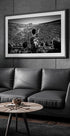 Uma poderosa fotografia em preto e branco que captura a atmosfera elétrica de um estádio de futebol lotado. Um jovem torcedor com camisa do Messi aponta para o campo, simbolizando paixão, heroísmo e o espírito unificador do jogo mais bonito do mundo. Esta obra é uma homenagem aos momentos de euforia que fazem do futebol mais do que um esporte.