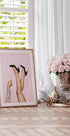 Um pôster ousado e estiloso que exala uma atmosfera de festa com pernas elegantes de salto alto preto e uma taça de champanhe espumante contra um fundo rosa pastel. A combinação de moda, celebração e glamour disco torna este pôster perfeito para interiores modernos.